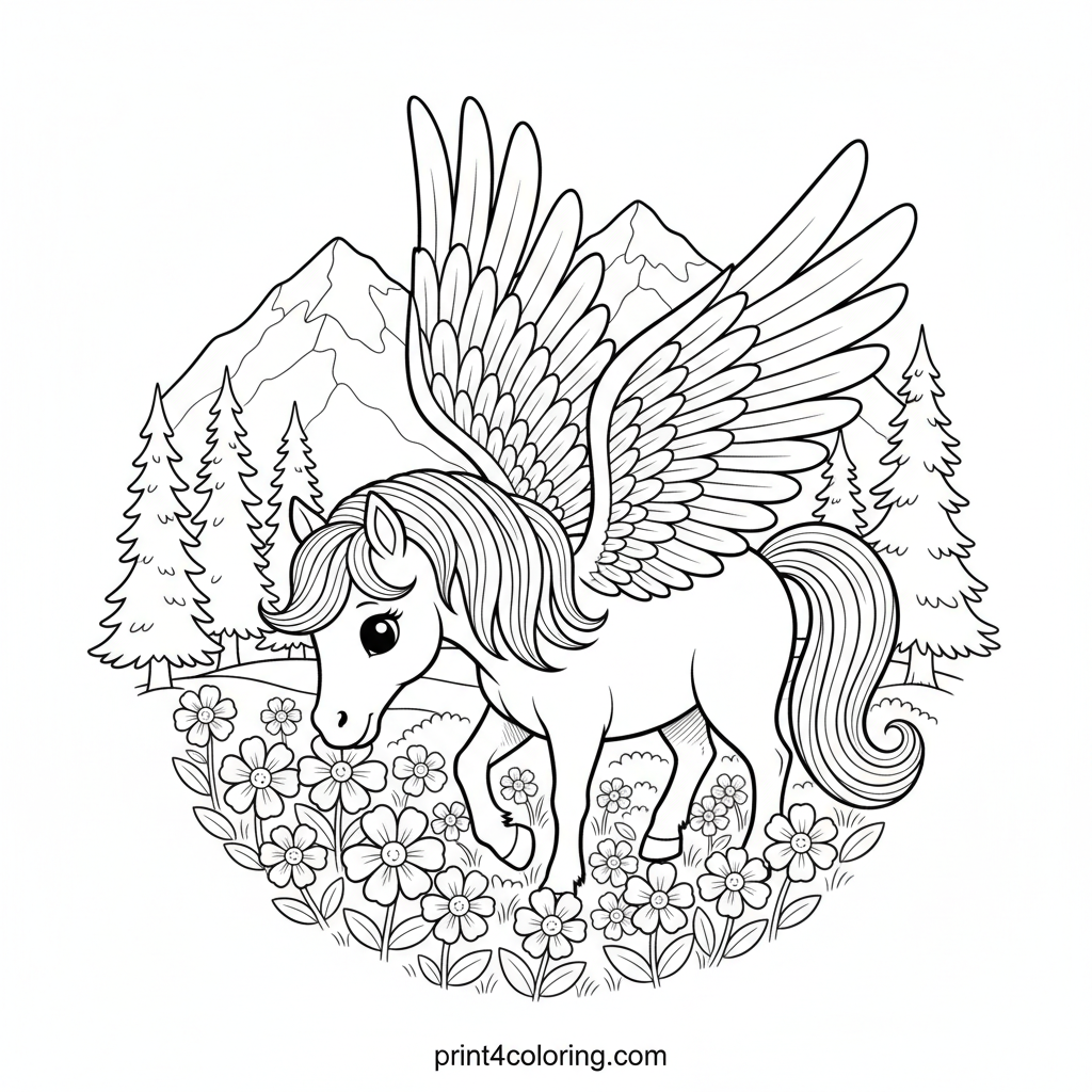 Soar into a serene mountain scene where a magnificent pegasus with intricate, feathered wings enjoys a peaceful meal of wildflowers. Gentle sunlight bathes the alpine meadow, surrounded by towering, detailed peaks and graceful pine trees. A truly magical and cozy coloring adventure awaits!