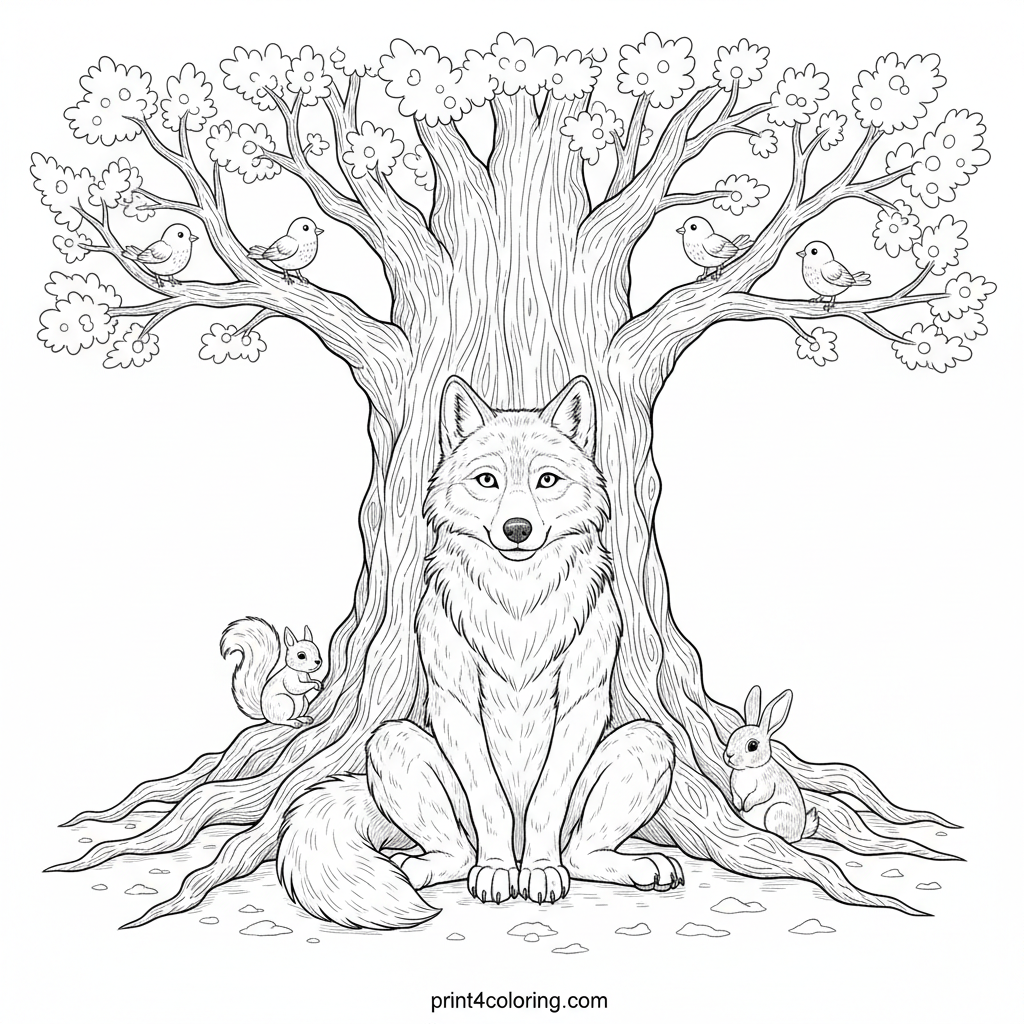 A majestic, wolf-like guardian with a gentle smile rests by a grand, ancient oak tree. Look closely and you'll spot tiny squirrels, chirping birds, and other friendly forest creatures nestled among its gnarled roots and leafy branches. This detailed scene invites you to bring its peaceful magic to life with your colors.