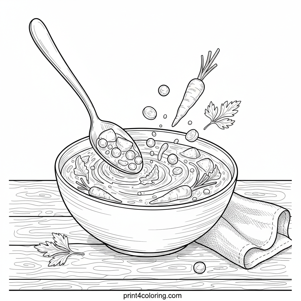 A Bowl of Warmth: Detailed Vegetable Soup Still Life Coloring Page