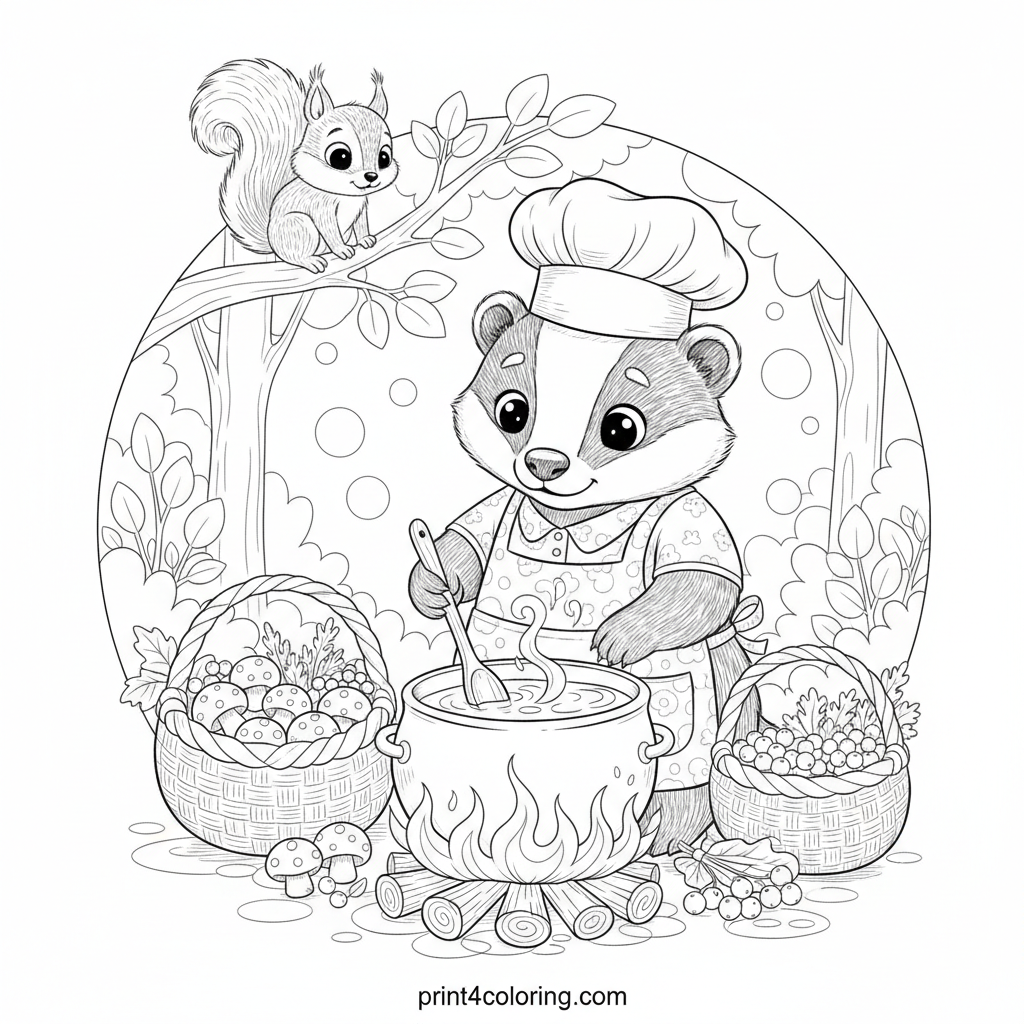 Step into a cozy forest clearing where a kind badger chef, in a detailed hat and apron, stirs a bubbling pot of delicious soup over a campfire. Surrounding him are baskets brimming with forest treasures – mushrooms, berries, and herbs. A curious squirrel watches from a branch, eager for a taste. This intricate scene promises hours of coloring fun!