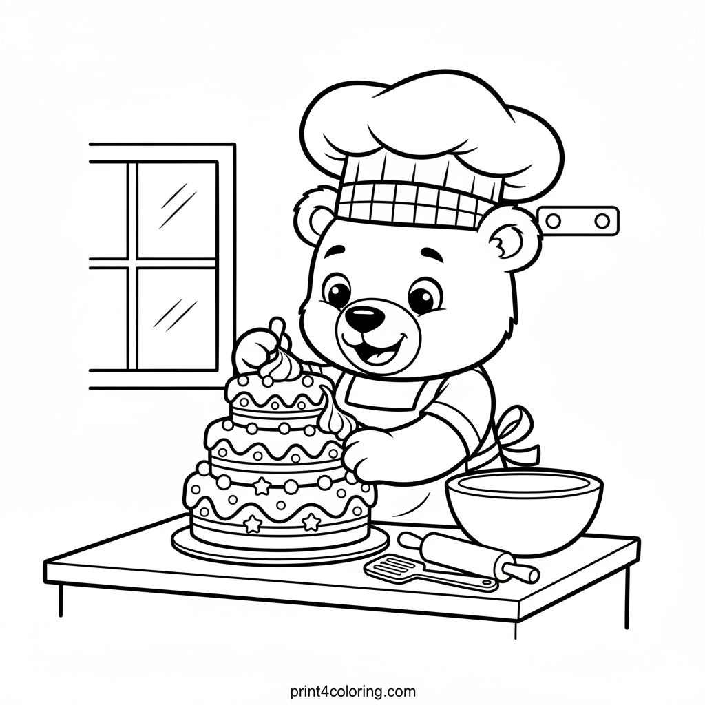 Join our happy bear baker in his cozy kitchen as he creates a magnificent, multi-layered cake! Watch him carefully add frosting swirls and colorful sprinkles, surrounded by his trusty kitchen tools. This delightful scene is bursting with yummy details, ready for you to bring to life with your favorite colors. A sweet adventure awaits!