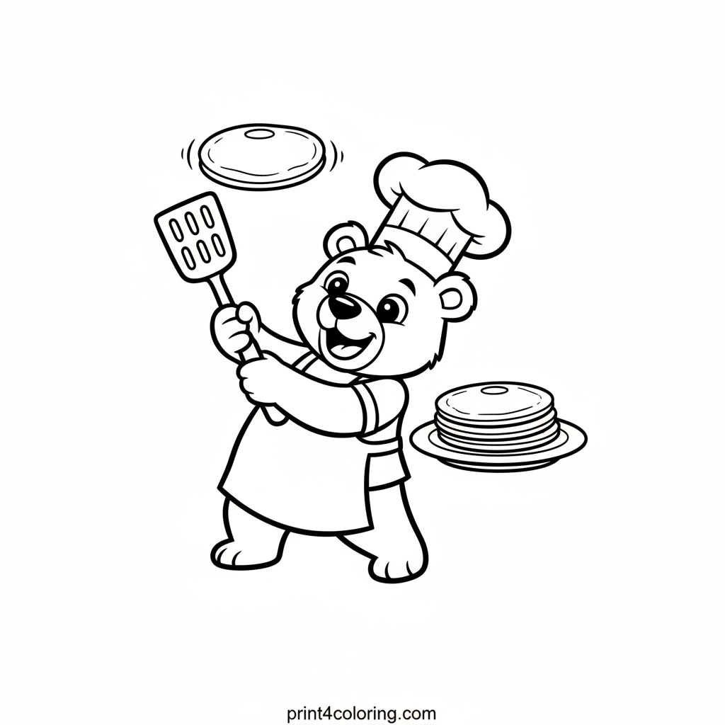 Get ready for breakfast fun with our happy bear chef! This delightful scene shows a cheerful bear in a tall chef's hat, joyfully flipping a pancake high with a spatula. Nearby, a stack of yummy pancakes waits on a plate, ready for syrup and toppings. A sweet and exciting coloring adventure for everyone!