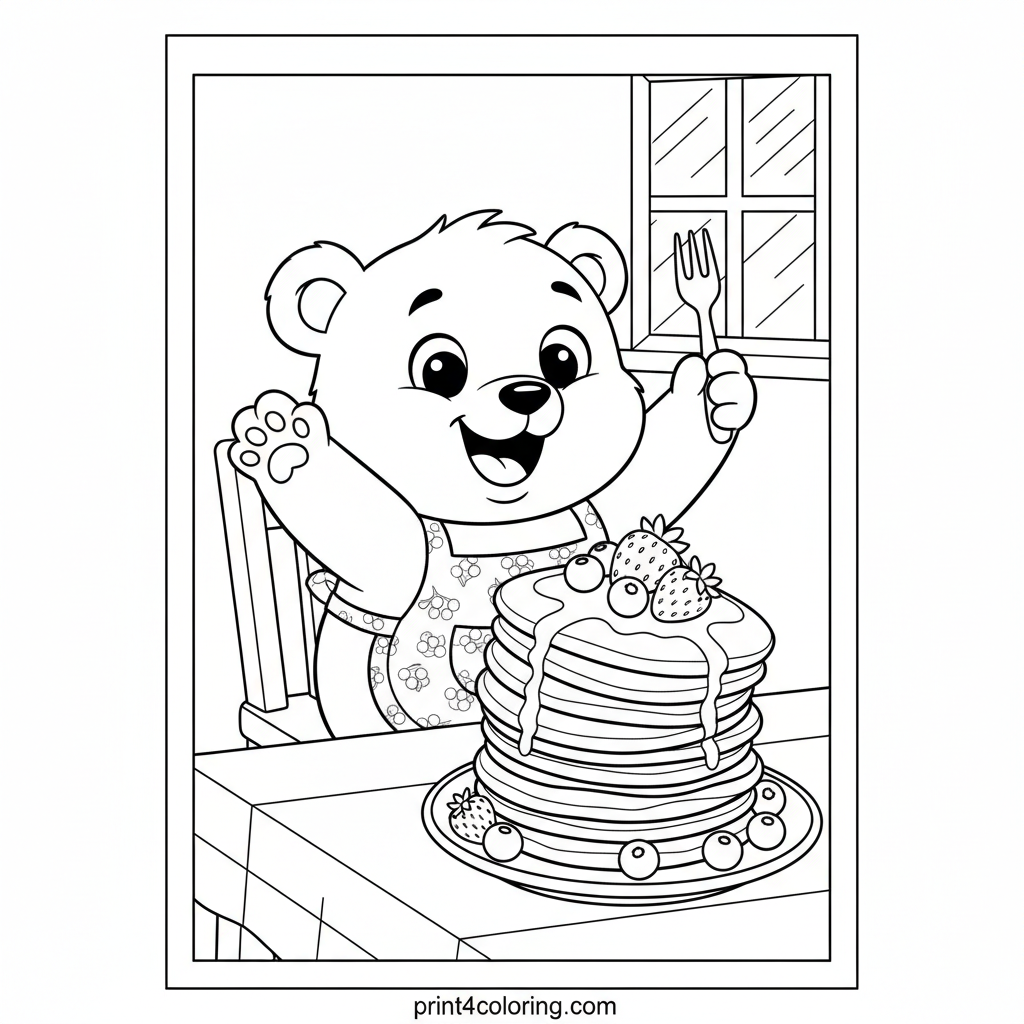 Meet a happy, round bear cub, wearing a cute apron, ready for the most delicious breakfast! He's sitting at a table with a towering stack of pancakes piled high with juicy berries, fork in hand. This adorable scene is bursting with fun, waiting for you to bring it to life with your favorite colors!