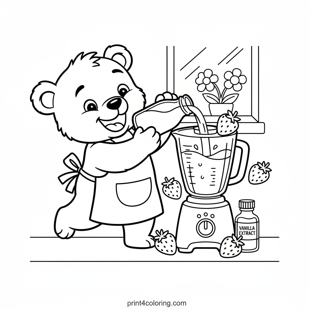 Join our adorable bear cub chef as they whip up a super yummy milkshake! Watch them carefully pour milk into a tall blender, surrounded by juicy strawberries and sweet vanilla extract. This delightful scene is perfect for little artists to bring to life with their favorite colors. Get ready for a delicious coloring adventure!