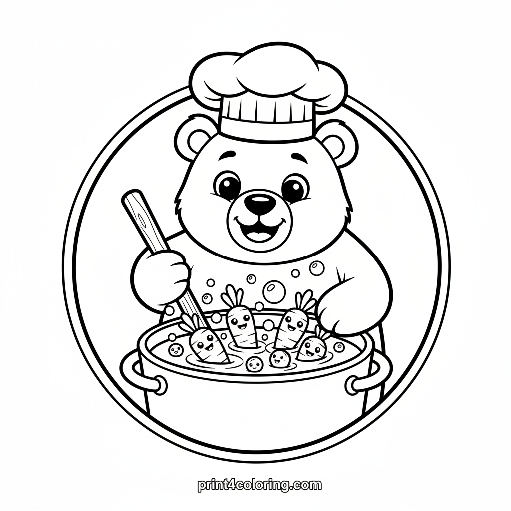 Dive into a delightful kitchen scene with a cheerful bear chef! He's happily stirring a giant pot of bubbling soup, with friendly carrots and peas peeking out. Bring this cozy culinary adventure to life with your favorite colors, making the steam rise and the flavors pop!