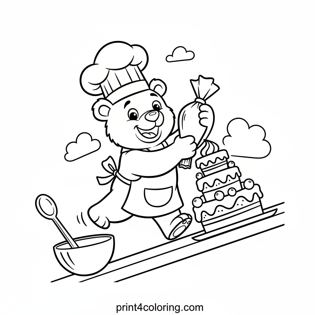 Join our happy bear baker as they put the finishing touches on a magnificent, multi-layered cake! Watch as they expertly swirl frosting and sprinkle colorful candies, creating a truly delicious masterpiece. Simple kitchen tools wait patiently nearby, ready for more baking adventures. This delightful scene is perfect for bringing to life with your favorite colors.