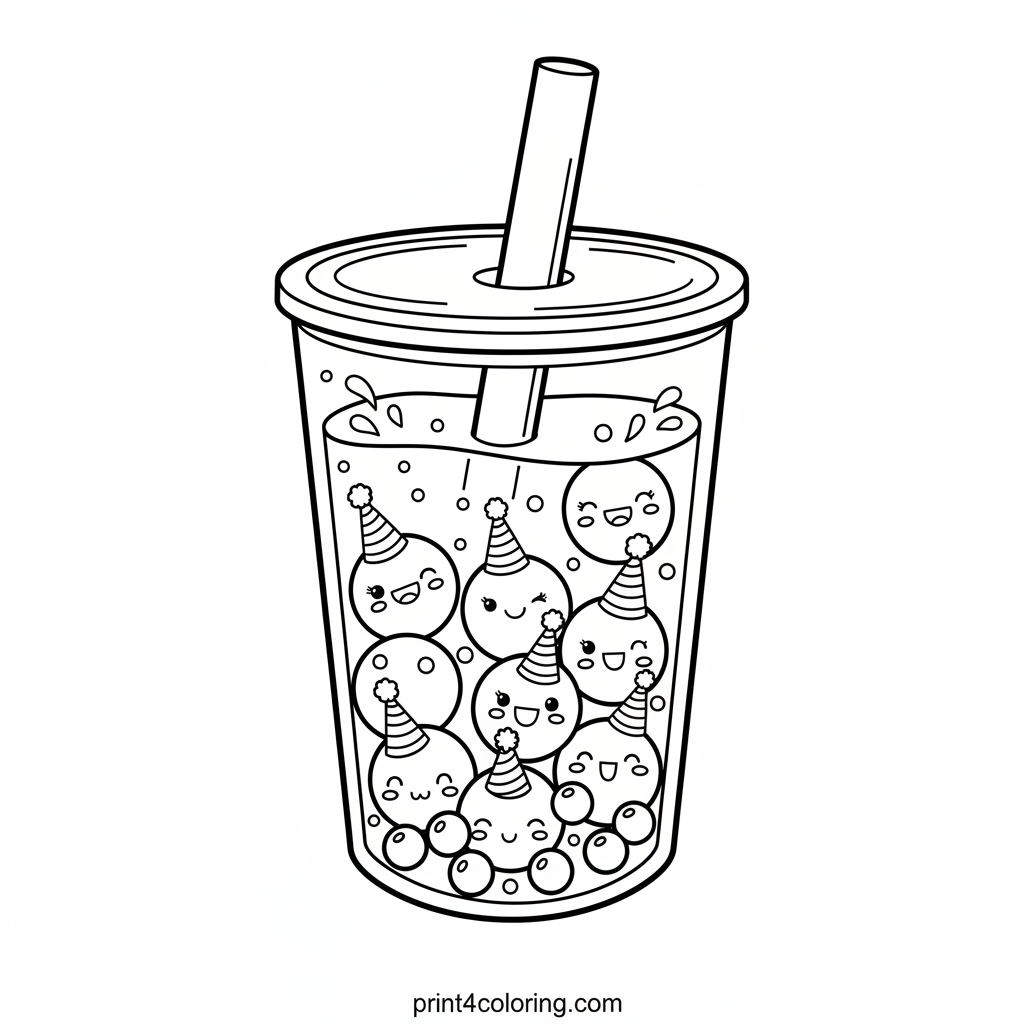 Dive into a delightful party where cheerful boba pearls are having a splash-tastic time! Each tiny tapioca friend wears a festive party hat, floating and giggling in a clear cup of sweet milk tea. Get ready to color this bubbly celebration and bring the joy to life with your favorite shades!