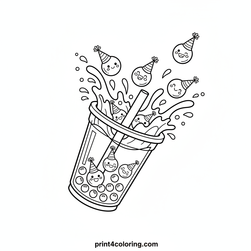 Dive into a delightful boba tea adventure! This page features cheerful boba pearls, donned in tiny party hats, having a grand time in their clear cup. Watch as some pearls float happily while others playfully splash milk tea, creating a joyful, bubbly scene ready for your vibrant colors.