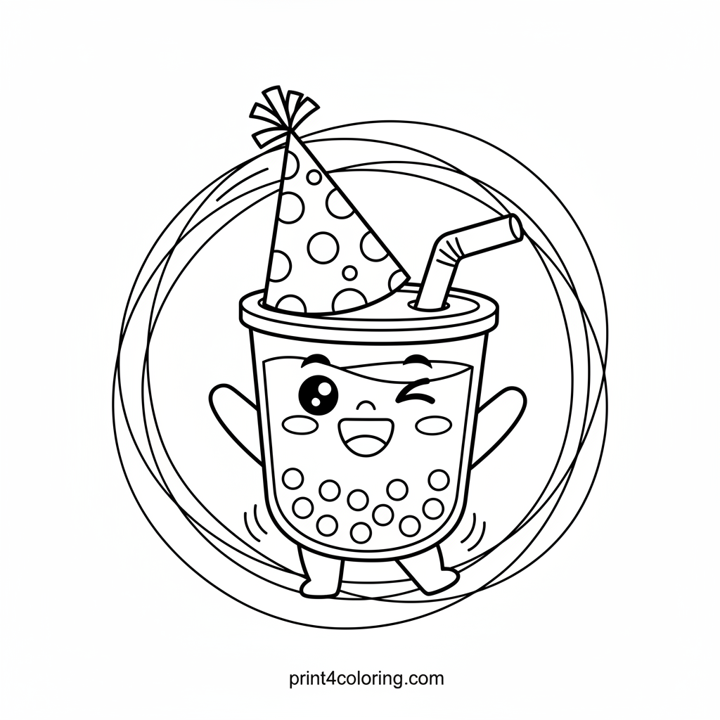 Get ready to giggle with Boba! This adorable boba tea cup is throwing the silliest hat party ever. Watch as it does a funny dance, balancing a giant, wobbly party hat covered in colorful sprinkles. Its straw playfully wiggles along. Grab your crayons and bring this joyful, dancing boba to life with your favorite colors!