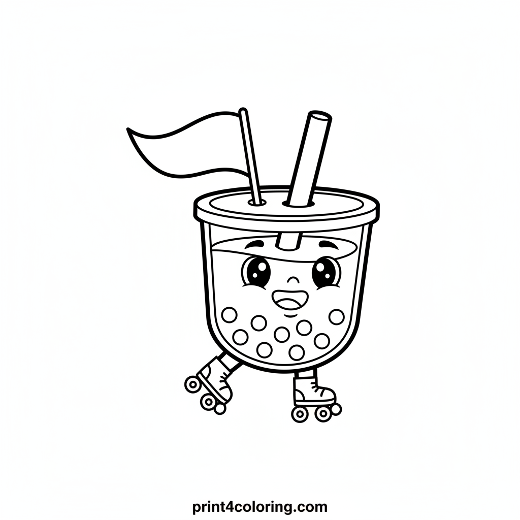 Get ready to race with our cheerful boba tea character! This happy cup is zooming along on tiny boba pearl roller skates, its straw waving like a flag. Imagine the exciting flavors and colors as you bring this speedy boba buddy to life on its fun path. A delightful adventure awaits!