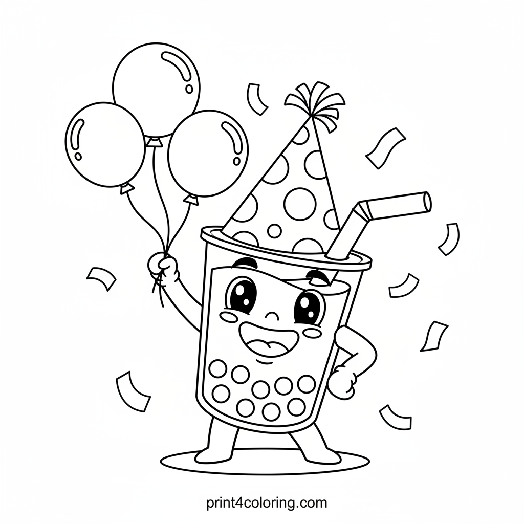 Join Boba the boba tea cup at a super silly hat party! This adorable character is wearing a giant, wobbly party hat covered in sprinkles, doing a funny dance. Its straw wiggles playfully. Get ready to add vibrant colors to this cheerful scene and bring Boba's hilarious party to life!