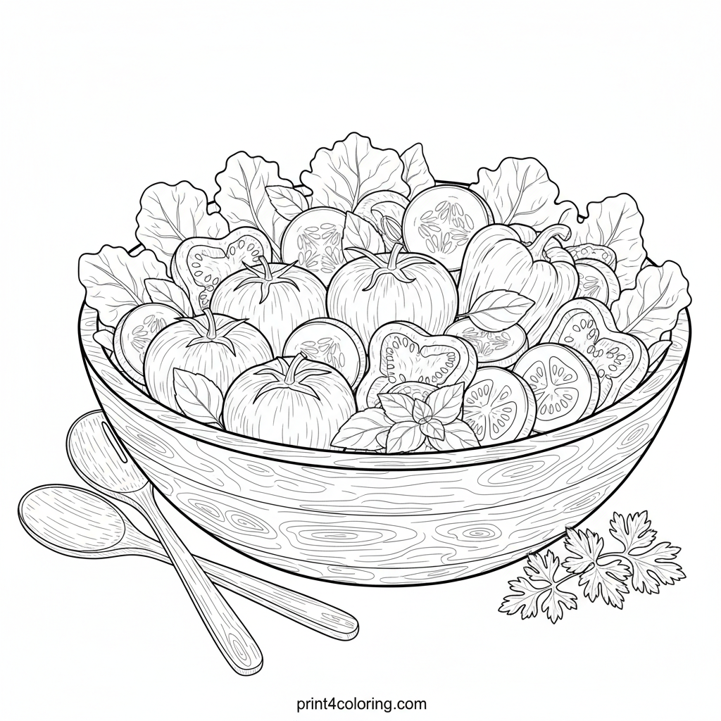 Dive into a detailed close-up of a rustic wooden bowl overflowing with garden-fresh goodness! This page showcases crisp lettuce, juicy heirloom tomatoes, cool cucumbers, and vibrant bell peppers, enhanced by fragrant basil and parsley. A wooden salad server rests nearby, inviting you to bring this bountiful harvest to life with your colors.