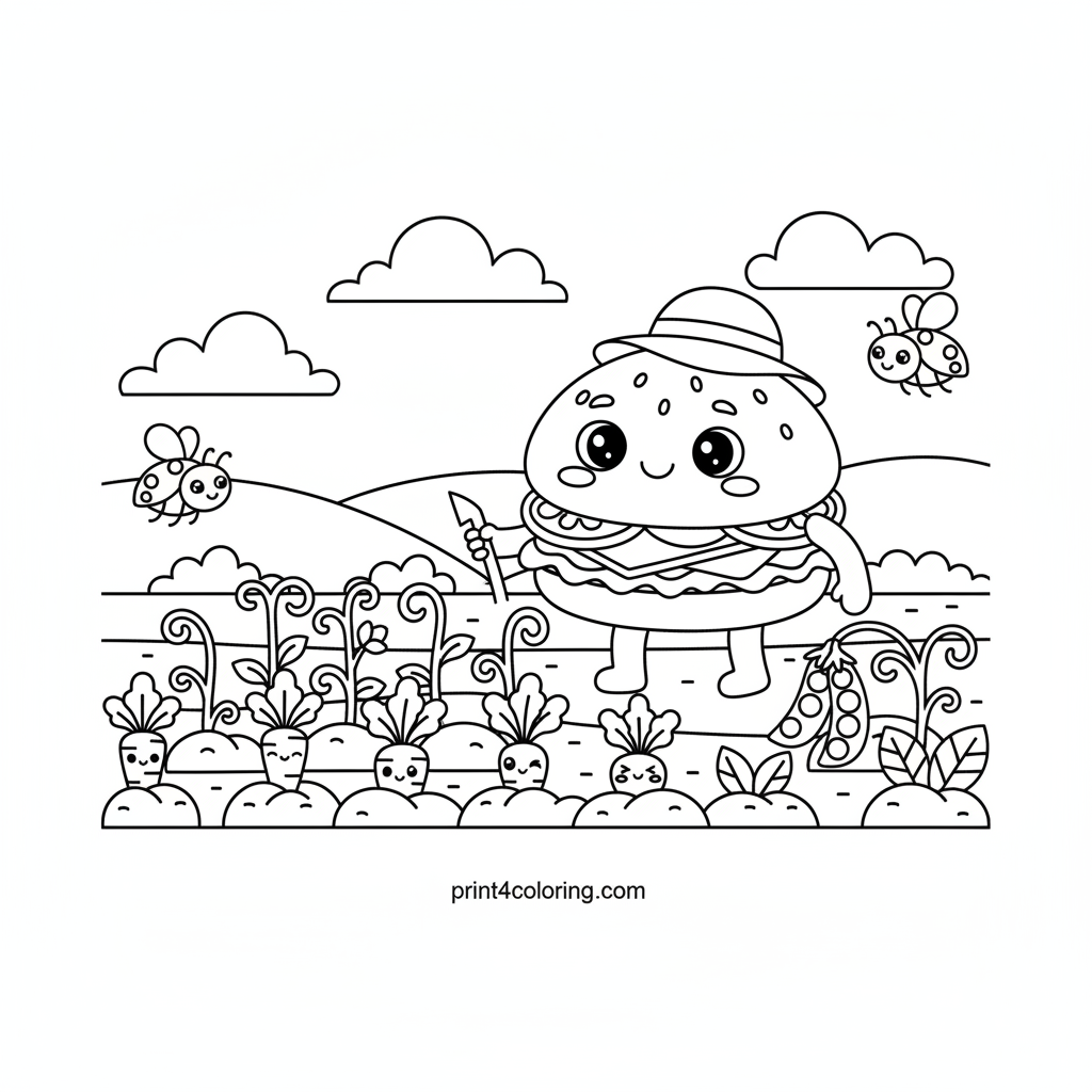 Step into a world of delicious fun with Burger Buddy in his magical garden! Watch as friendly vegetables like smiling carrots and winking peas grow on whimsical vines. Oversized, happy ladybugs flutter around, making this a truly joyful and imaginative scene. Grab your crayons and bring this delightful veggie patch to life with vibrant colors!