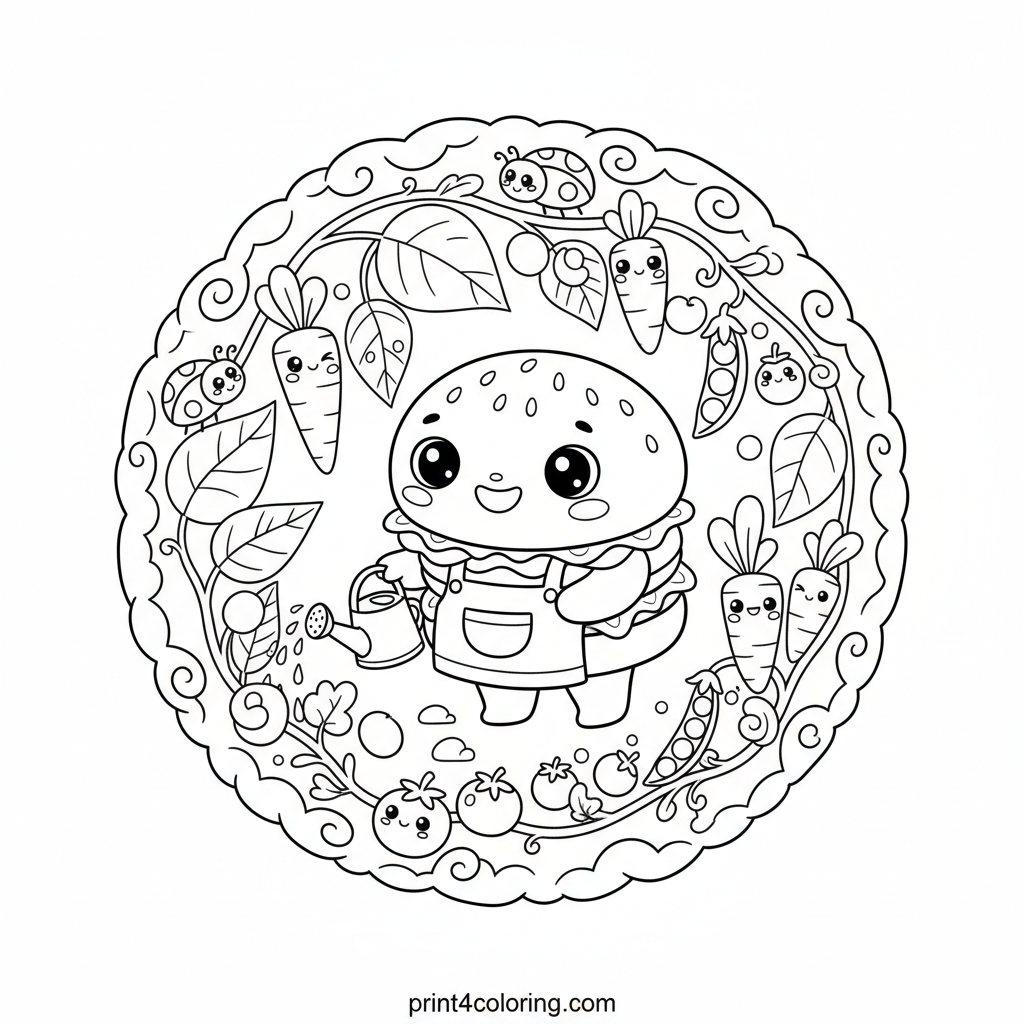 Join our cheerful burger friend tending a magical garden! Discover tiny, happy vegetables like smiling carrots and winking peas growing on whimsical vines. Friendly, oversized ladybugs flutter around, adding cozy charm. Get ready to bring this delightful scene to life with your favorite colors and imagination!