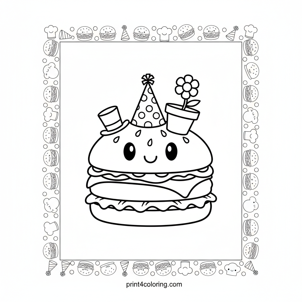 Join our cheerful burger friend in a silly hat parade! This happy burger is balancing three funny hatsβa tiny top hat, a festive party hat, and even a flower pot hatβall stacked high. It looks a little wobbly, but our burger is smiling wide, inviting you to add vibrant colors to its hilarious balancing act!