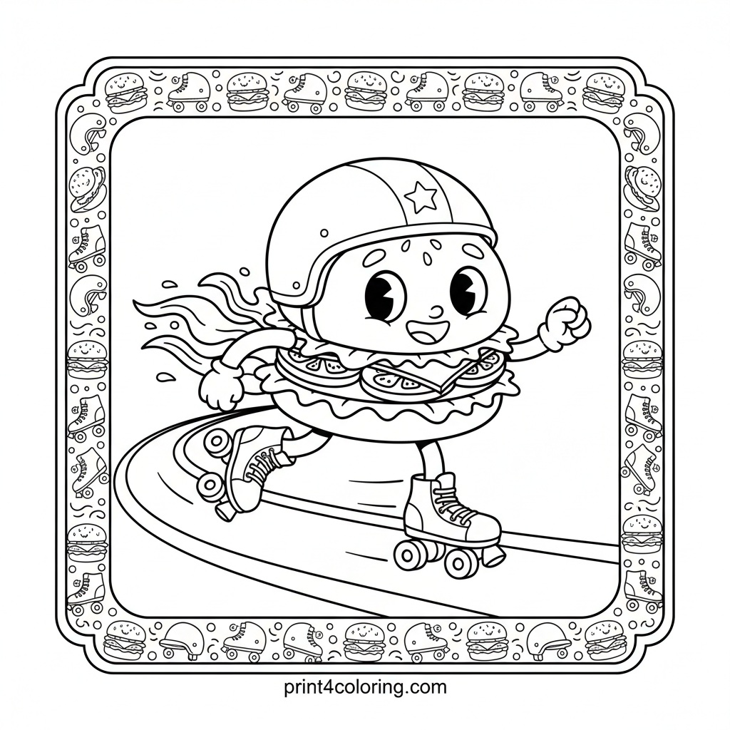 Get ready for a delicious adventure! Join a cheerful burger character, complete with roller skates and a cool helmet, as it zips down a winding path. Watch its lettuce and tomato layers playfully blow in the wind, all while sporting a big, happy smile. A super fun scene for young artists!