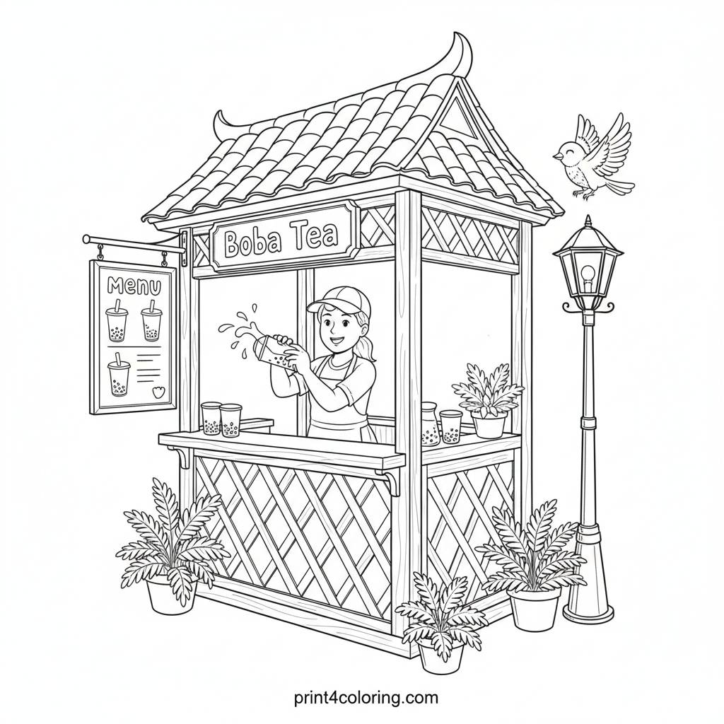 Bustling Boba Tea Kiosk Adventure Coloring Page