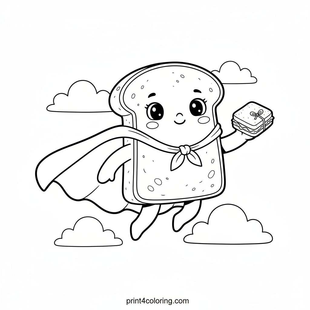 #sandwich#superhero#food#delivery#flying#cape#cute#cozy#fantasy#lunch#imagination#coloring-page#printable