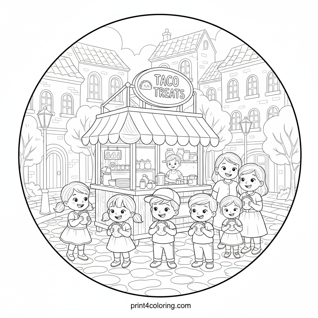 Step back in time to a bustling historic city square! This detailed coloring page features a cute, vintage taco stand surrounded by old-world buildings and charming cobblestone streets. Look closely at the happy families enjoying their delicious tacos, with intricate trees and lampposts adding to the cozy atmosphere. A delightful scene for expert colorists!