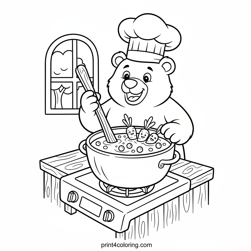 Join Chef Bear in his cozy kitchen as he whips up a giant pot of delicious, bubbling soup! With his tall chef's hat and a big ladle, he stirs in friendly carrots, peas, and more. This fun scene is perfect for little artists to bring to life with their favorite colors. What tasty ingredients will you add?