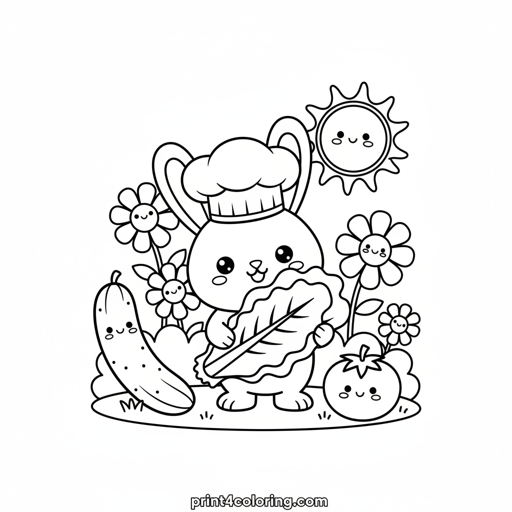 Join Chef Hoppy, the happiest bunny in the garden, as he proudly shows off his incredible harvest! He's holding a giant lettuce leaf almost as big as himself. Look closely and you'll spot his friendly veggie pals, a cheerful tomato and a smiling cucumber, ready to join the fun. Get your crayons ready for a delicious adventure!