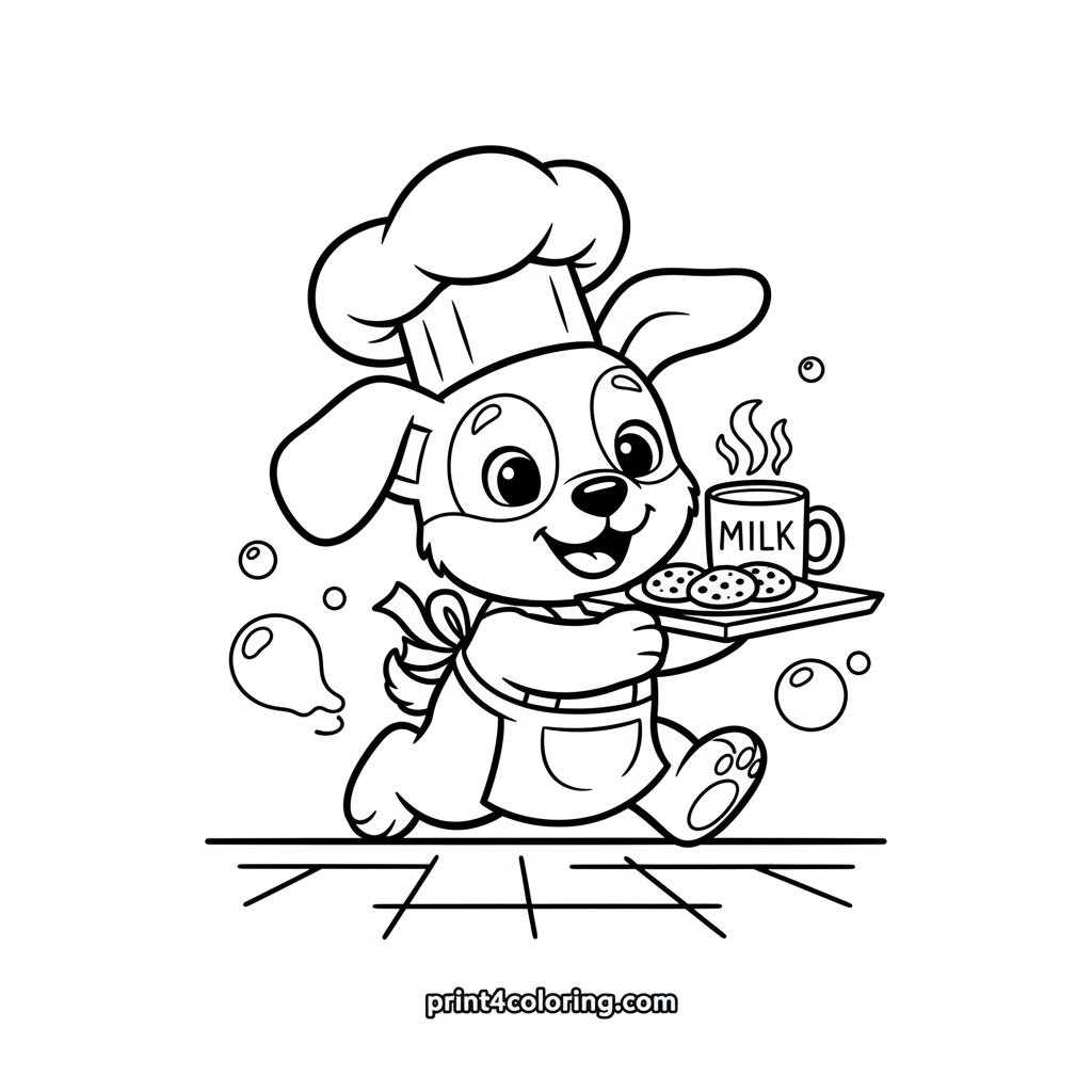 Join a super cute puppy on a whirlwind morning adventure! Dressed in a tiny chef's hat and apron, this happy little dog is zooming across the kitchen floor, playfully 'delivering' a tray with a warm mug of milk and yummy cookies. Get ready to add vibrant colors to this speedy, cheerful scene!