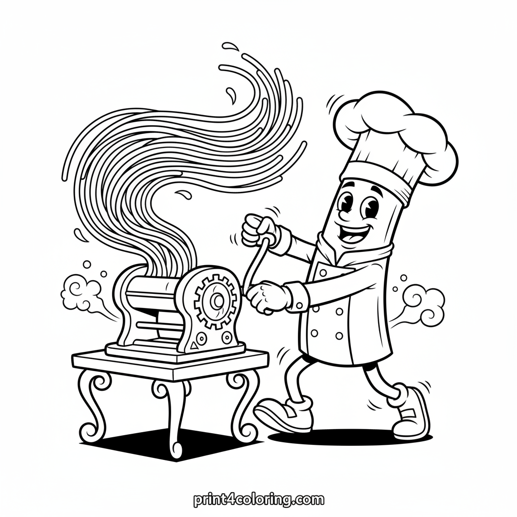 Join Chef Ziti, the cheeriest pasta chef, as he joyfully cranks his amazing noodle machine! Watch long, playful strands of spaghetti tumble out, ready for a delicious feast. This delightful scene features a friendly ziti-shaped chef with a big hat, perfect for bringing to life with your brightest colors and imagination.