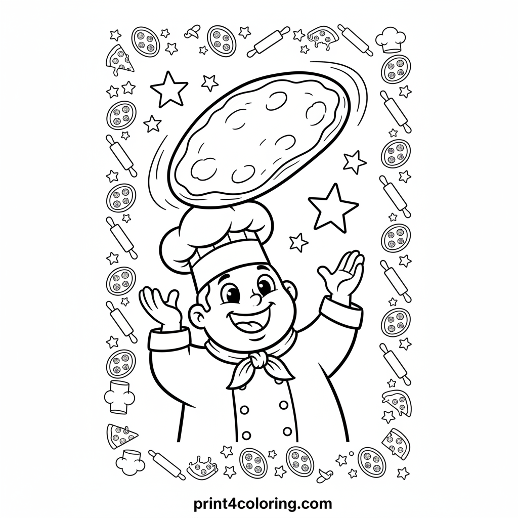 Watch our happy cartoon chef perform an amazing culinary trick! With a tall hat and a big smile, he's tossing a giant pizza dough high into the air. Stars twinkle around the spinning dough, ready to be colored with vibrant imagination. Get ready to add your favorite colors to this joyful kitchen scene!