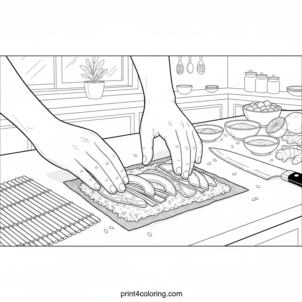 Step into a bustling sushi kitchen with this detailed coloring page! Watch a skilled chef's gentle hands meticulously arrange colorful ingredients – glistening fish, fluffy rice, crisp cucumber, and creamy avocado – onto a nori sheet. A bamboo mat and sharp knife are nearby, ready to transform these fresh elements into a delicious sushi roll. Bring this culinary art to life!