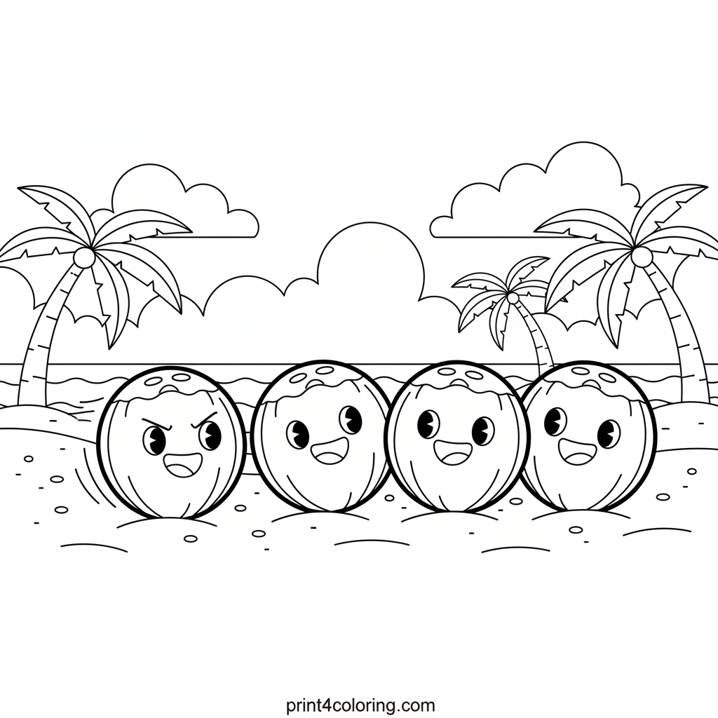 Get ready for a tropical strike! This fun coloring page shows three friendly coconuts lined up like bowling pins on a sunny sandy beach. Watch out – another round, determined coconut is rolling right towards them, ready to knock them all down. A perfect sunny game for a beach day!