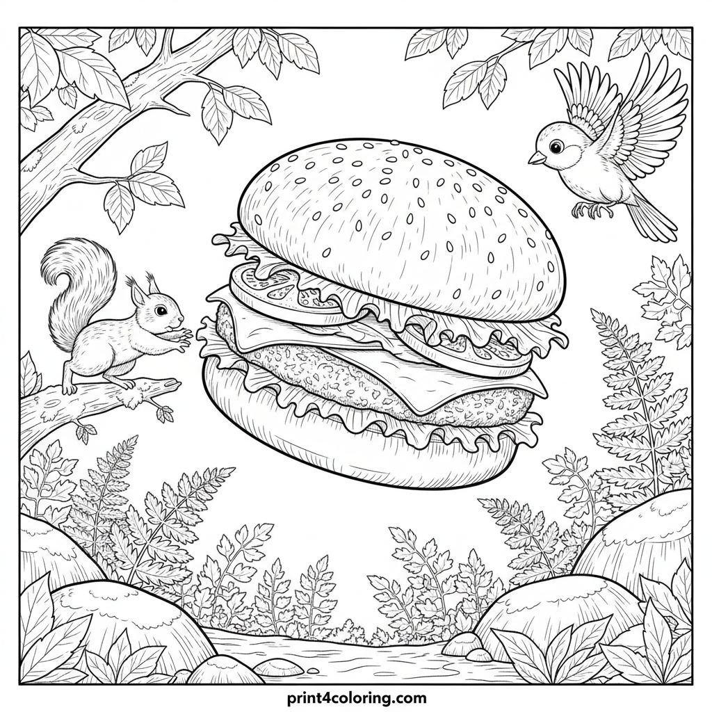 Step into a magical forest where an enormous, delicious burger rests in a sun-kissed clearing! Observe the intricate details of the bun, crisp lettuce, juicy tomato, and melted cheese. Curious squirrels and tiny birds gaze in wonder at this colossal feast, inviting you to add vibrant colors to this whimsical nature scene.