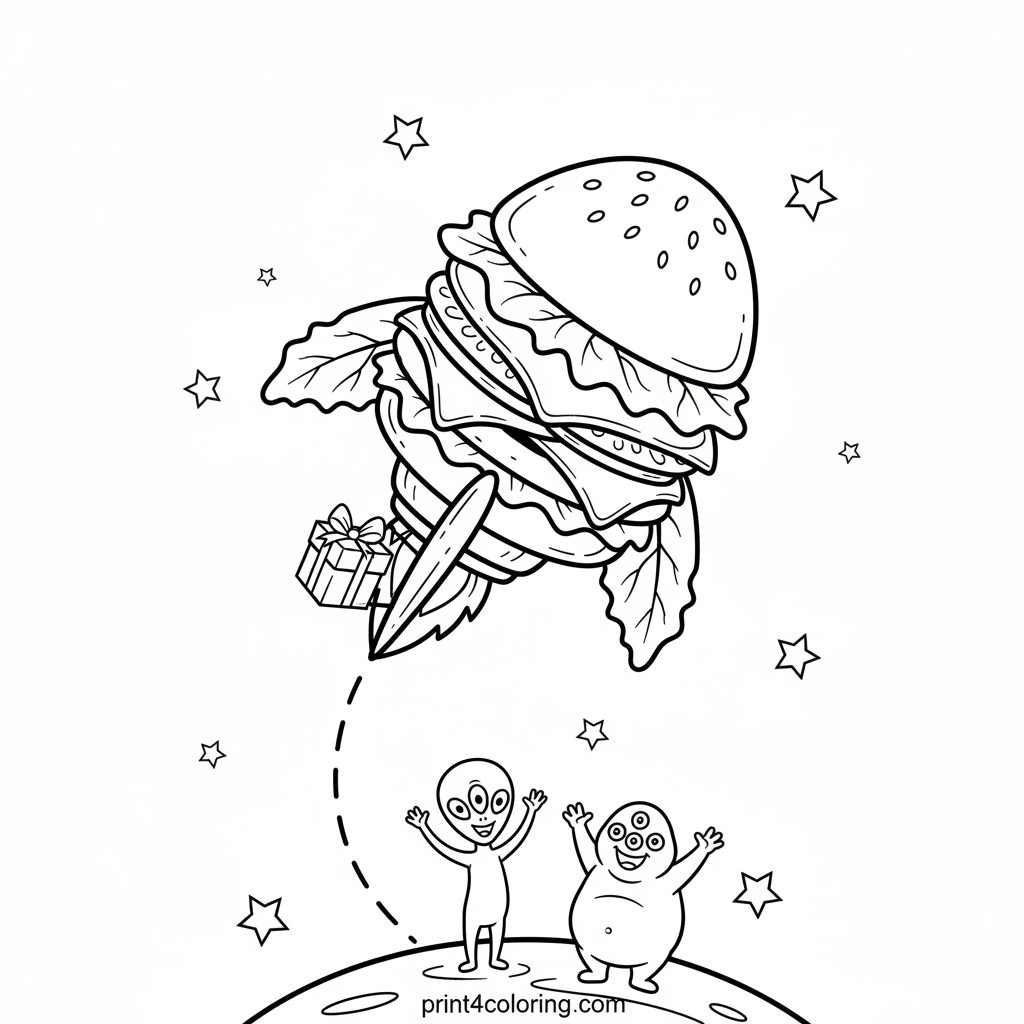 Imagine a super cool burger rocket zipping through space! This yummy ship, with its sesame bun top and lettuce fins, is on a special mission. It's delivering delicious meals to friendly aliens on a far-off planet, making sure everyone gets their favorite galactic grub. Get ready for an out-of-this-world coloring adventure!