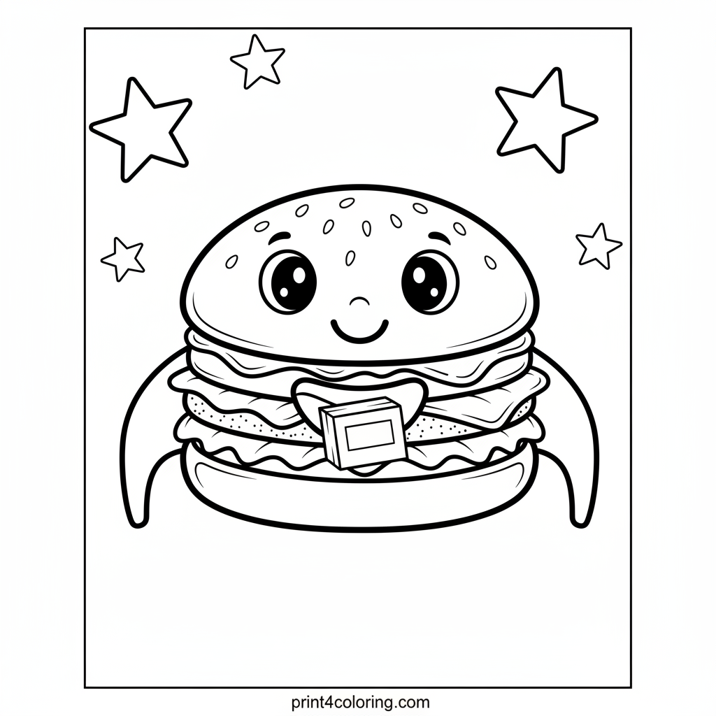 Blast off with the Cosmic Burger Delivery Rocket! This fantastic ship, shaped like a giant burger with sesame seed buns and lettuce fins, zooms through a starry sky. Color the yummy food it carries to playful alien creatures on a distant planet. A delicious, out-of-this-world adventure awaits!