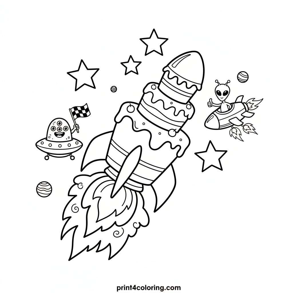 Blast off into a delicious adventure! This coloring page features a giant rocket-shaped cake, complete with frosting flames, zooming through a star-filled sky. Two cheerful alien friends in their speedy spaceships are racing right alongside it. Get ready to add vibrant colors to this sweet cosmic competition!
