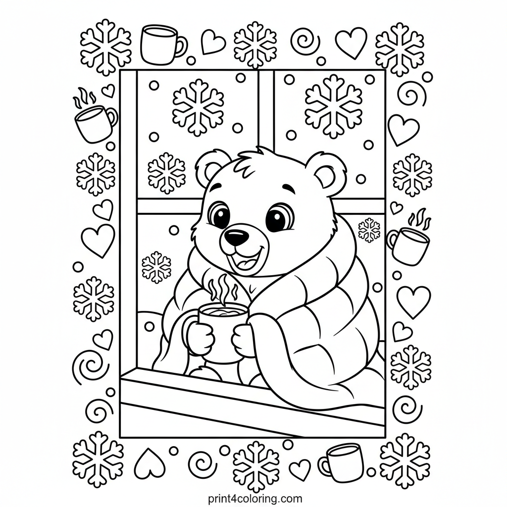 Imagine a fluffy bear cub, wrapped snugly in a soft blanket, enjoying a warm cup of hot chocolate! Snowflakes dance outside the window as this adorable cub sips a yummy treat. This heartwarming scene is perfect for little artists to bring to life with their favorite colors. Get ready for a cozy coloring adventure!