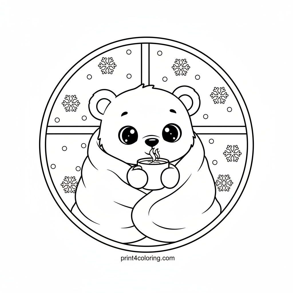 Snuggle up with this adorable coloring page featuring a sweet bear cub! Bundled in a soft blanket, our little friend enjoys a warm mug of hot chocolate by a window, watching snowflakes dance outside. A perfect scene for a cozy coloring adventure, full of warmth and winter charm.