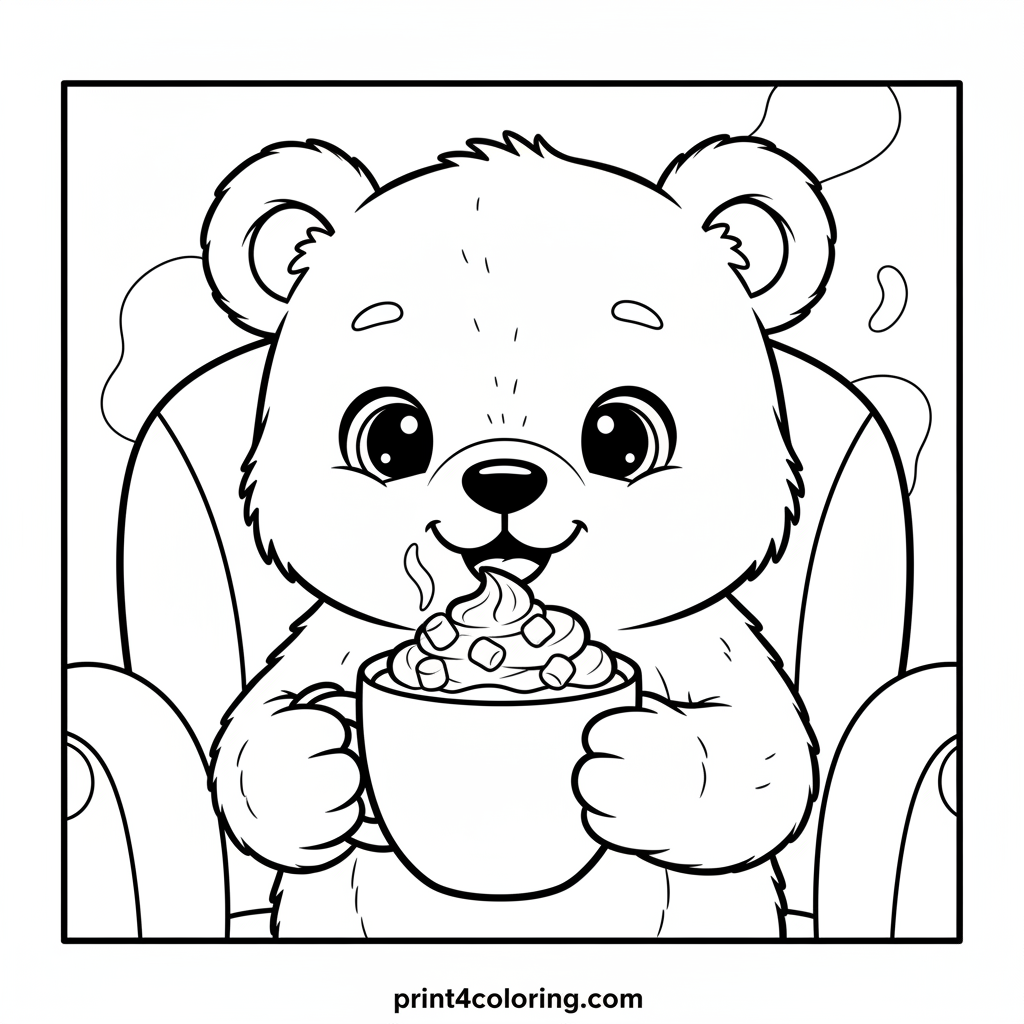 Snuggle up with our adorable bear cub enjoying a warm mug of hot chocolate! This fluffy friend has big, happy eyes and is nestled in a comfy armchair beside a crackling fireplace. Imagine the warmth and deliciousness as you color in the whipped cream swirl. A perfect scene for a cozy day!