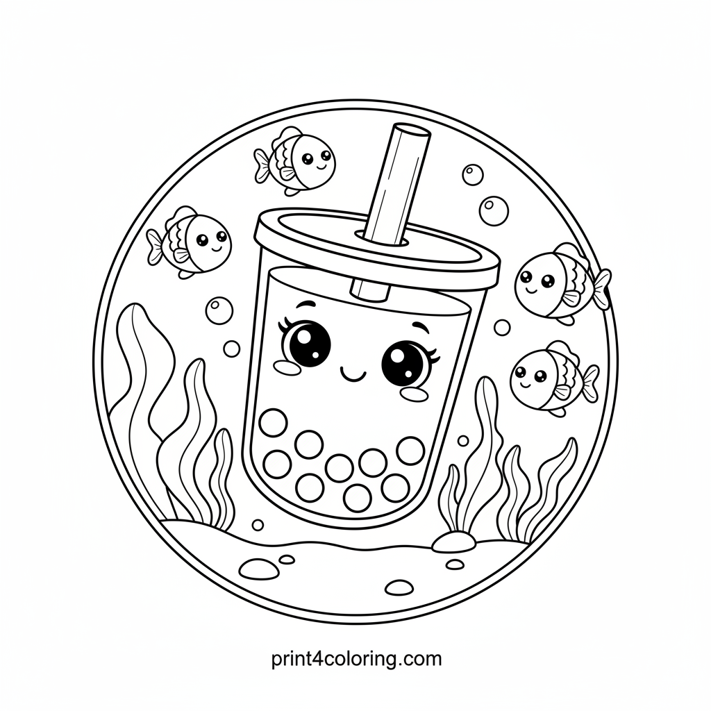 Dive into a delightful underwater world! A friendly boba tea cup floats gently, surrounded by happy fish and graceful sea plants. Its boba pearls glow softly like tiny, magical treasures. Bring this charming, cozy ocean scene to life with your favorite colors and make it sparkle!