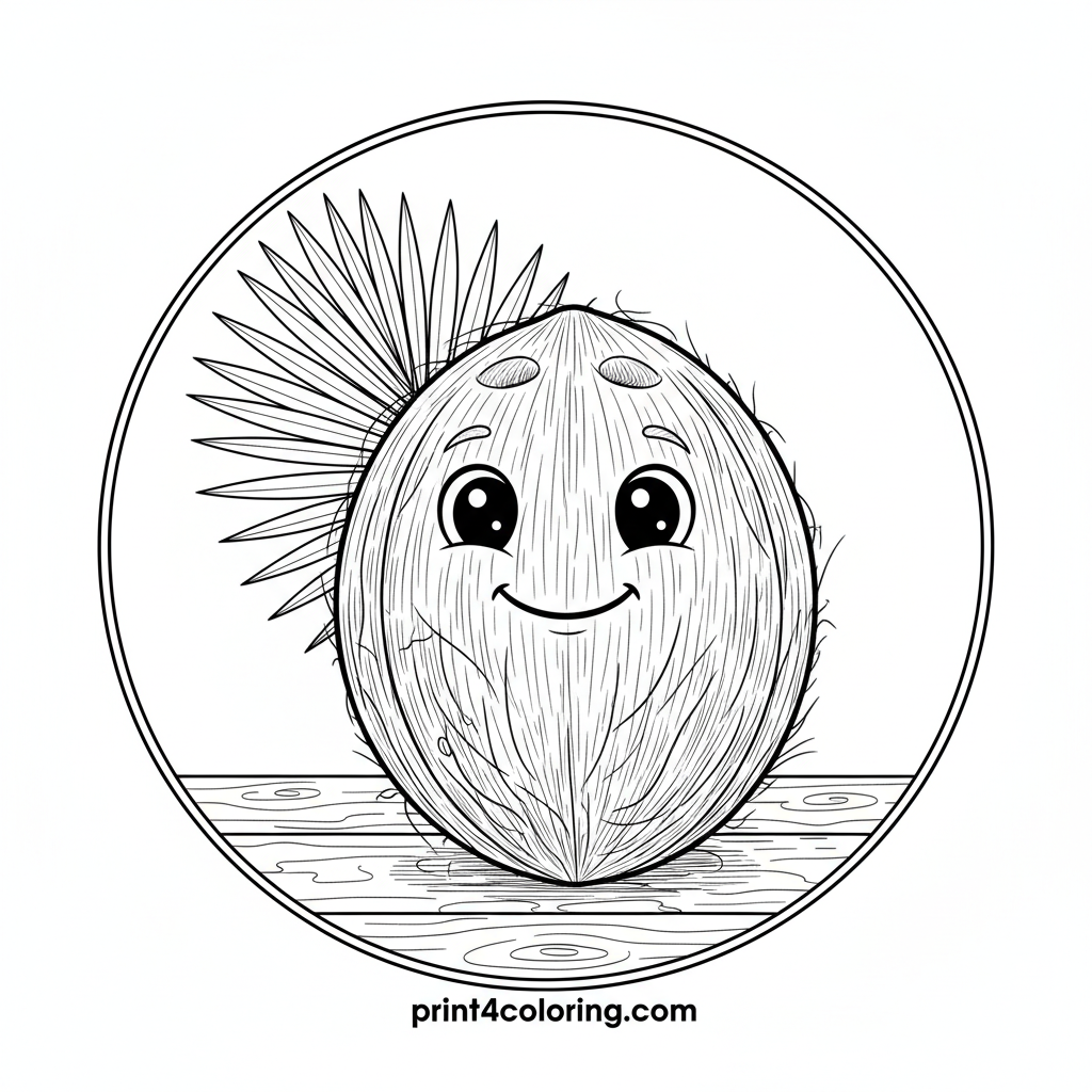 Explore the intricate beauty of a whole coconut! This detailed page showcases its unique fibrous husk and distinct 'eyes', resting gently on a rustic wooden surface. A graceful fanned palm leaf adds a touch of tropical charm, inviting you to explore every texture and shade in this cozy island scene.
