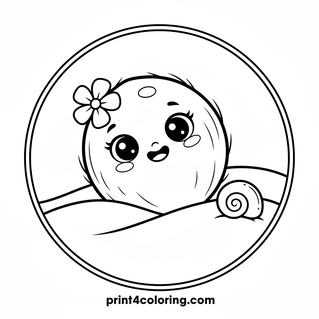 Imagine a perfect beach day with our adorable, smiling coconut friend! This happy little coconut, wearing a sweet flower, is relaxing peacefully on a soft sand dune. A tiny seashell rests nearby, adding to the cozy scene. Grab your crayons and bring this tropical pal to life!