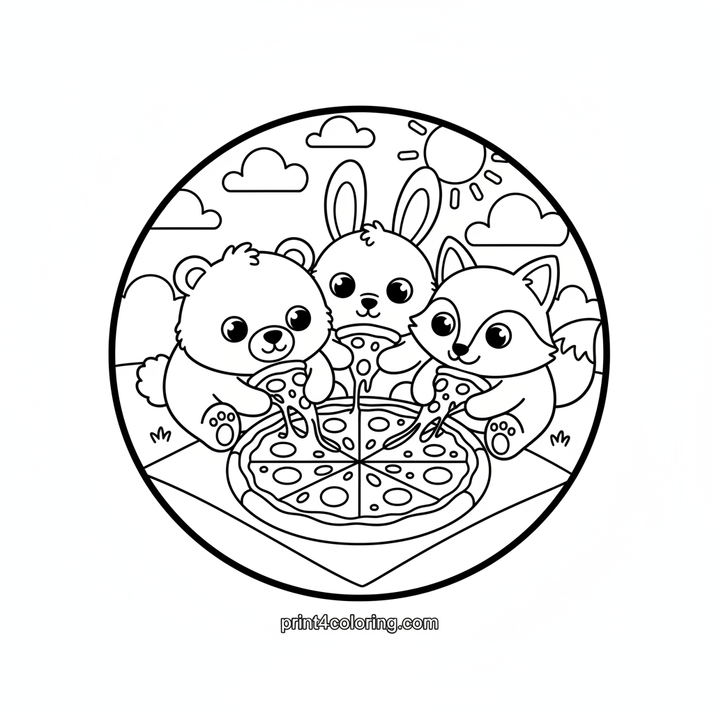Join an adorable group of forest friends – a fluffy bear, a playful bunny, and a clever fox – as they gather for the ultimate pizza feast! Watch them giggle and stretch for gooey, cheesy slices of a giant pizza spread on a cozy picnic blanket. This delightful scene is full of warmth, friendship, and delicious fun, perfect for young artists to bring to life with vibrant colors.
