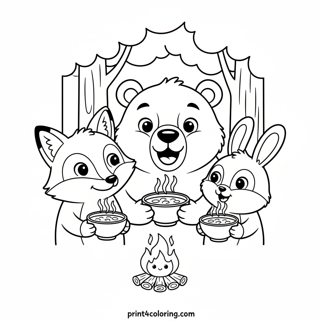 Gather 'round the warm campfire with a happy bear, a playful fox, and a tiny bunny! These adorable forest friends are enjoying steaming bowls of soup, sharing laughter and stories under the gentle trees. Imagine the cozy glow and delicious smells as you bring this heartwarming scene to life with your colors.