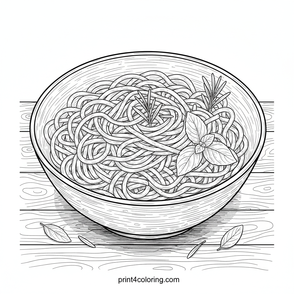 Dive into the delicious details of this expert-level coloring page! Explore a beautifully arranged ceramic bowl brimming with intricately coiled noodles. Delicate sprigs of fresh herbs add a touch of nature, while subtle shadows on a textured wooden surface create depth. Perfect for those who love to color with precision and bring realistic scenes to life.