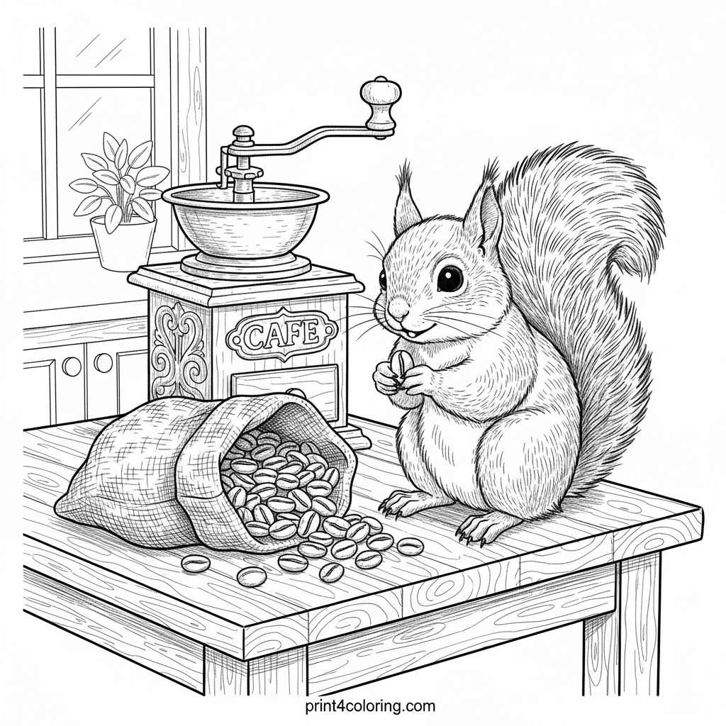 Curious Squirrel's Coffee Bean Adventure Coloring Page