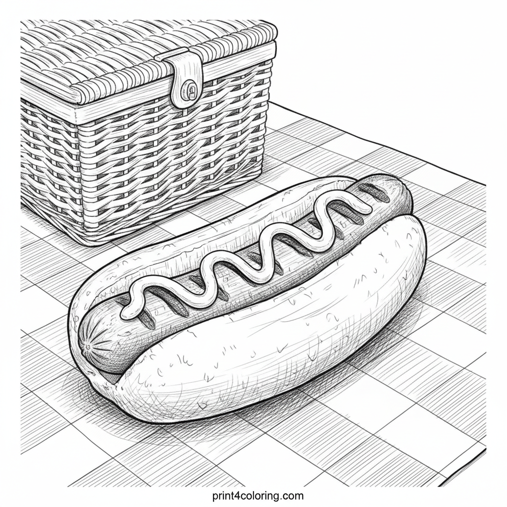 Dive into a delightful picnic scene! Color a perfectly grilled hotdog, complete with swirly mustard and ketchup, nestled on a classic checkered blanket. A charming wicker picnic basket waits in the background, hinting at more summer treats. A mouth-watering adventure awaits your colors!
