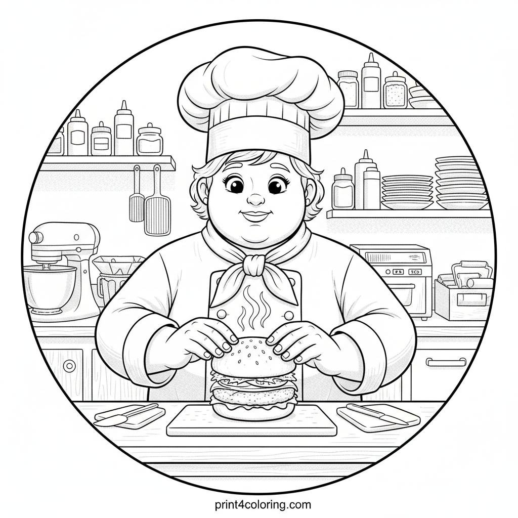 Step into a bustling diner kitchen where a friendly chef carefully crafts a delicious burger! Watch as they place the top bun on a steaming patty, surrounded by gleaming kitchen equipment and shelves packed with ingredients. This detailed scene captures the magic of culinary creation, perfect for coloring.