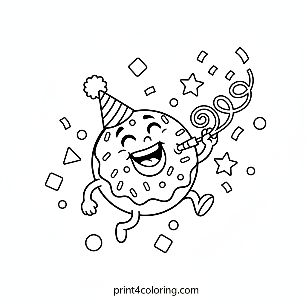 Get ready to celebrate with our super happy donut! This delicious friend is wearing a tiny, silly party hat and blowing a festive party blower, sending confetti flying everywhere. Imagine all the bright colors you can use to bring this joyful scene to life. It's a sweet celebration just waiting for your artistic touch!
