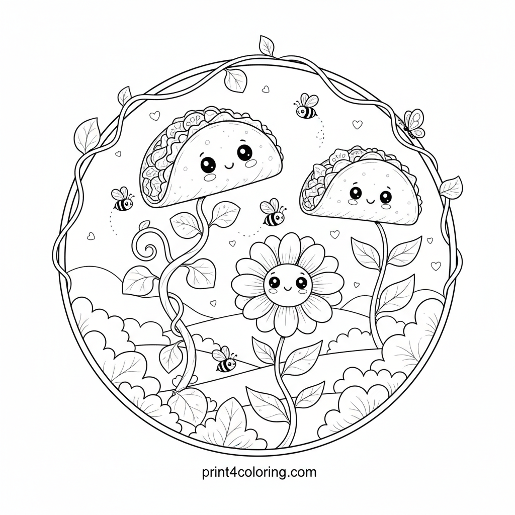 Step into a magical world where tacos grow on plants! This intricate coloring page invites you to explore an enchanted garden blooming with soft-shell vines and hard-shell flowers. Discover busy bees and fluttering butterflies pollinating the delicious 'taco flora' amidst lush leaves and a cozy natural landscape. A truly whimsical scene for imaginative colorists!