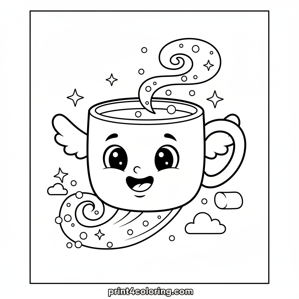 Friendly Flying Mug in Marshmallow Sky Coloring Page
