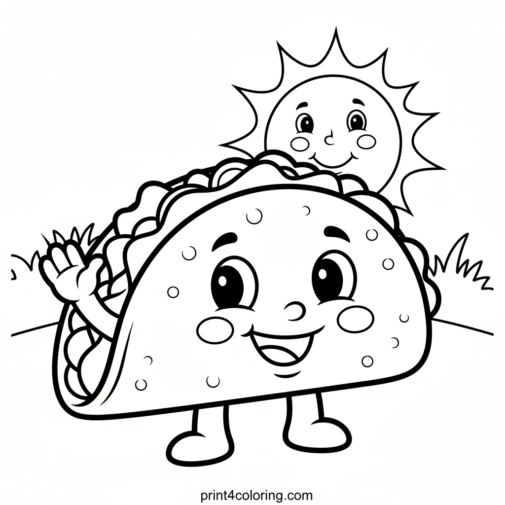 #taco#food#cute#waving#cartoon#friendly#mexican-food#sun#hill#coloring-page#printable